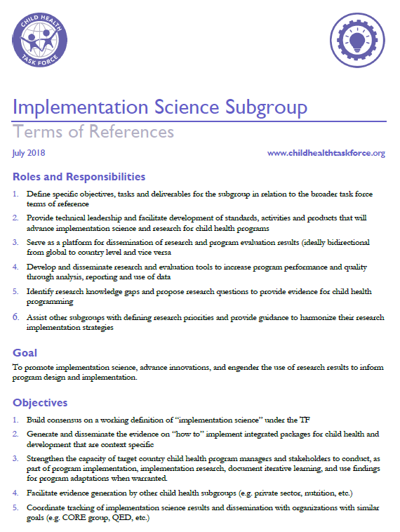 Termes de référence élaborés en 2018 pour le sous-groupe du groupe de travail sur la santé des enfants, Science de la mise en œuvre.