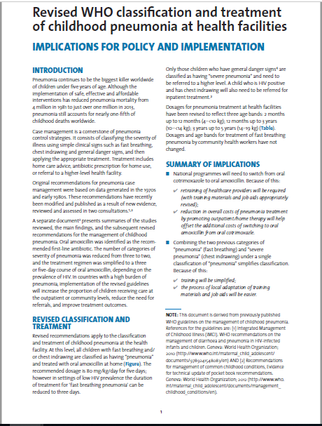 Year Published 2014 Resource Type Report Advocacy Package: Pneumonia Policy Brief - (WHO, 2014)235.68 KB Report details the World Health Organization's classification and treatment of childhood pneumonia at health facilities.